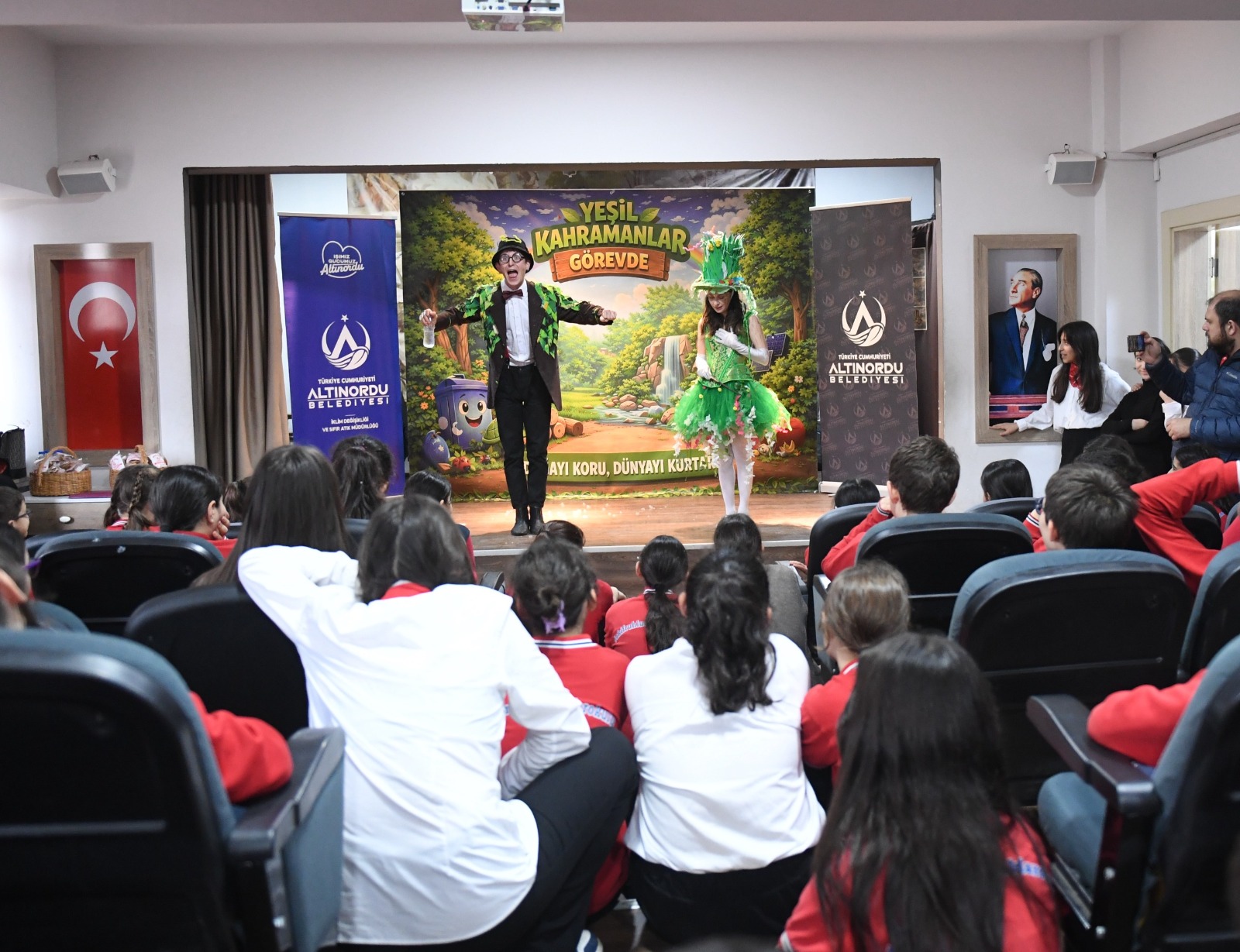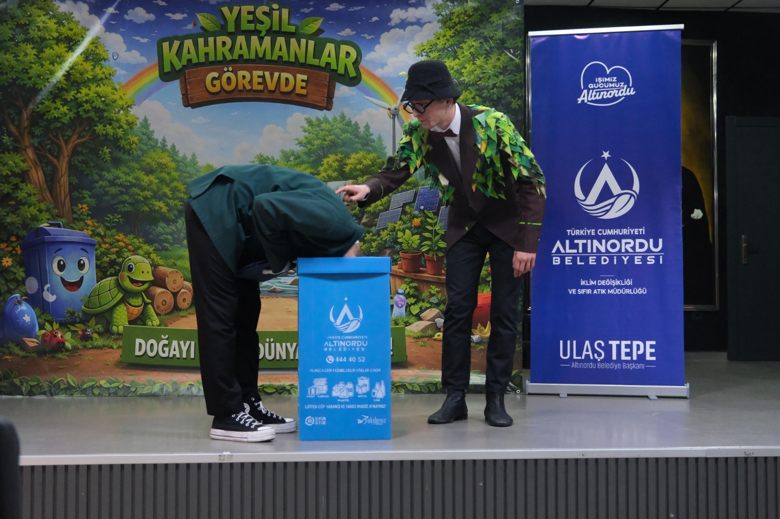 Altınordu Belediyesi İklim Değişikliği ve Sıfır Atık Müdürlüğü, 30 Mart Uluslararası Sıfır Atık Günü kapsamında kentteki okullarda ‘Yeşil Kahramanlar Görevde’ tiyatro etkinliği düzenledi. Sırasıyla Eyüplü Şehit Sezar Aydın İlk ve Ortaokulu, Mehmet Akif Ersoy Ortaokulu, Karacaömer İlk ve Ortaokulu, Haki Yener İlkokulu ile Başöğretmen İlk ve Ortaokulu’nda sahnelenen tiyatro oyunuyla öğrencilere temiz çevre, sıfır atık ve geri dönüşüm konularında bilgiler aktarıldı. Öğrenciler, sahnede kahraman karakterlerin maceralarını izlerken, geri dönüşümün ve sıfır atık uygulamalarının günlük yaşamda nasıl uygulanabileceğine dair ipuçları aldı.