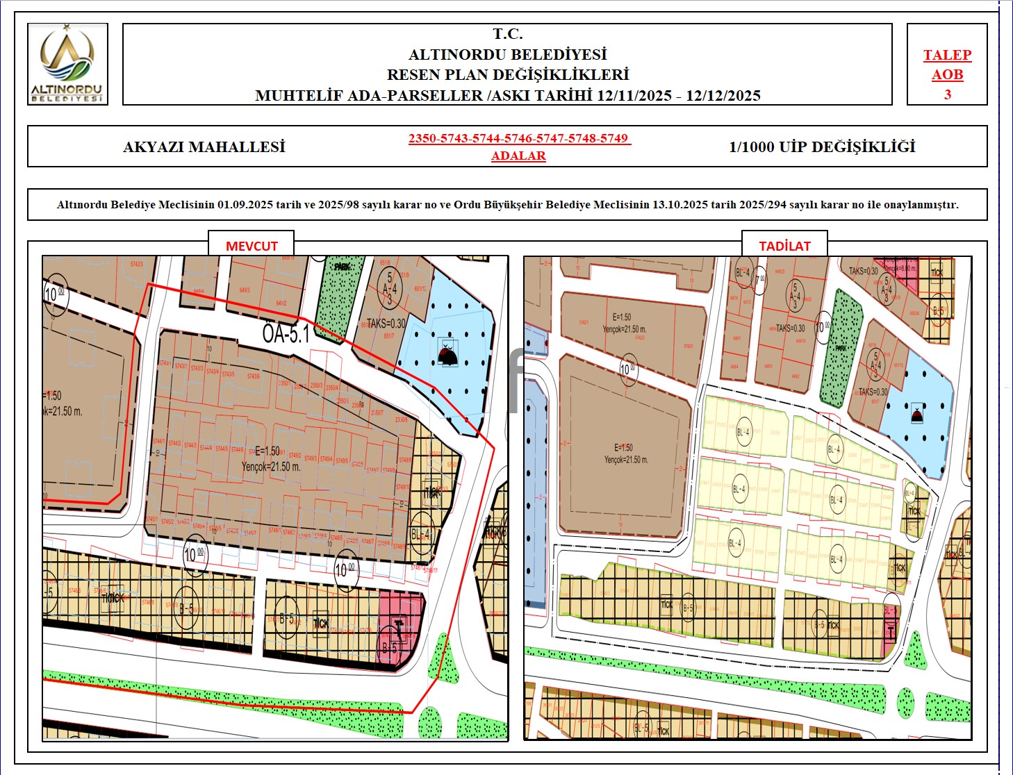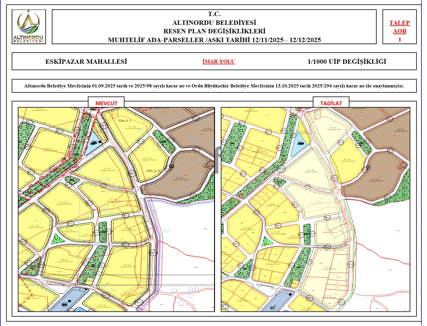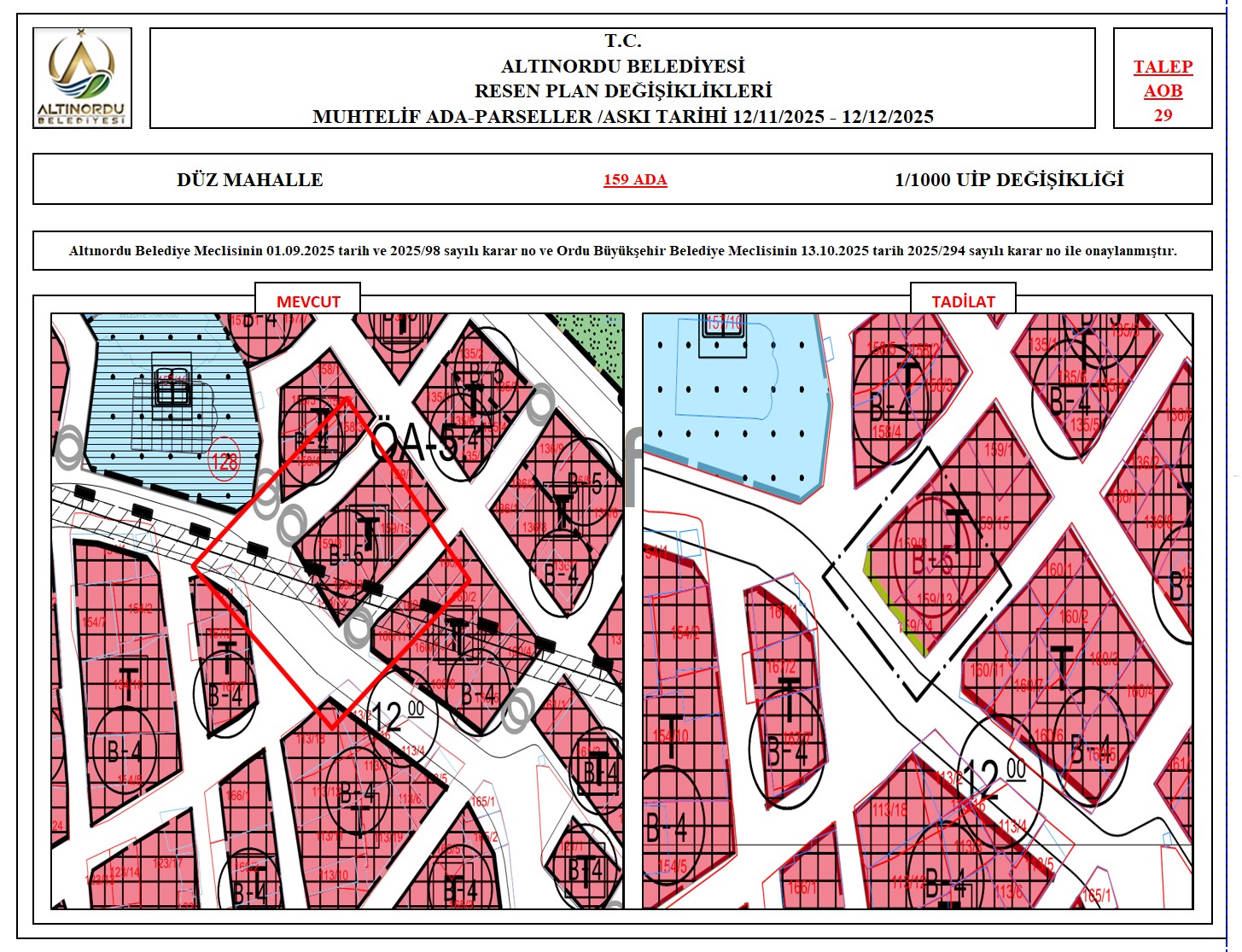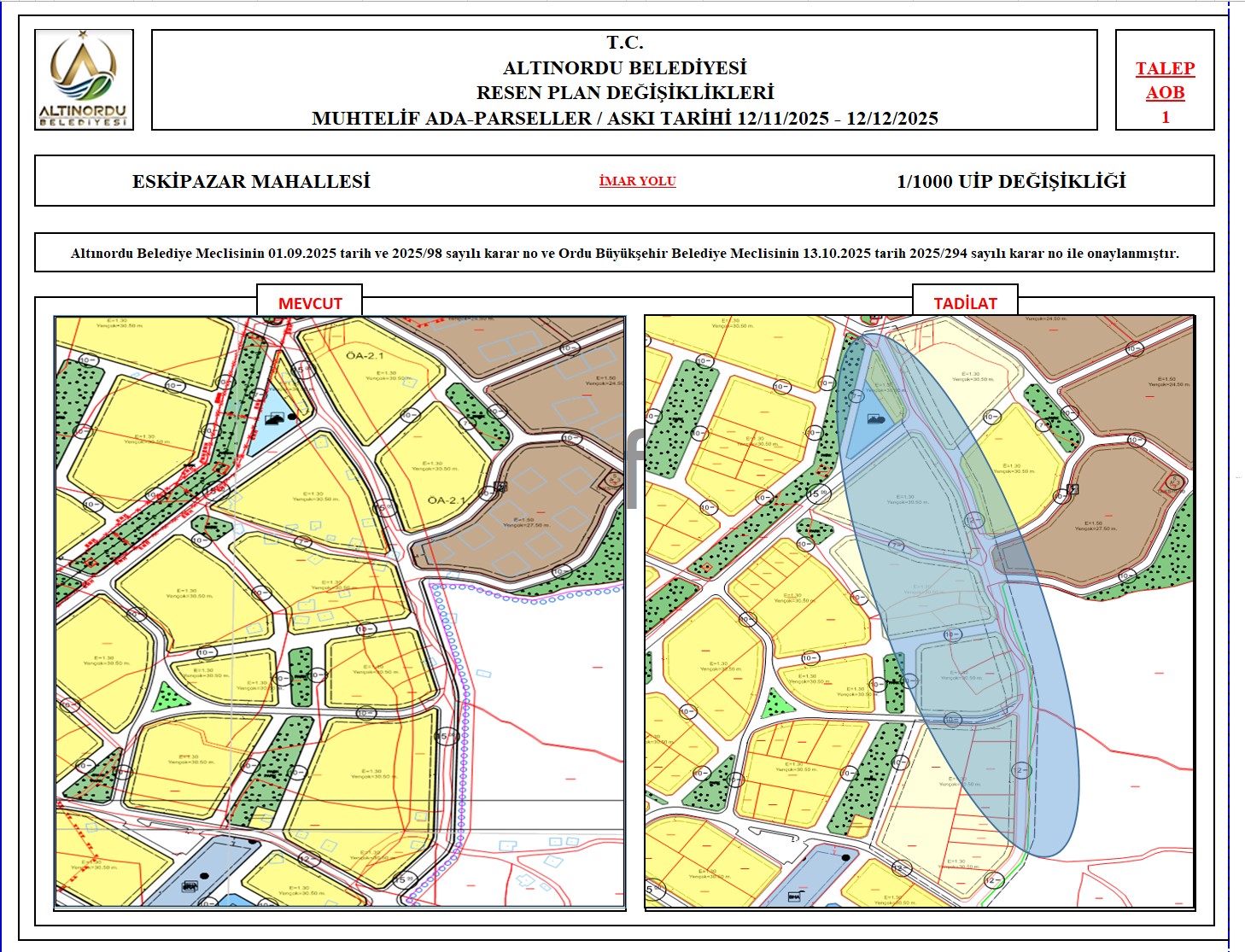 İlimiz, Altınordu İlçesi̇ uygulama imar planı onama sınırları ı̇çerı̇sı̇nde, Ordu Büyükşehir Belediyesi tarafından yapılan nazım imar plan değişikliklerine istinaden; alt ölçekleri planların üst ölçekli planlara uyum şartı esas olduğundan ve uygulamada karşılaşılan sorunların çözümüne yönelik; muhtelif ada/parsellerde Pin UİP:001106375 numaralı 1/1000 ölçekli Uygulama İmar Plan Değişikliği Altınordu Belediye Meclisinin 01.09.2025 tarih ve 2025/98 sayılı karar no ve Ordu Büyükşehir Belediye Meclisinin 13.10.2025 tarih 2025/294 sayılı karar no ile onaylanmış imar kanunun 8b maddesi gereğince 12/11/2025 – 12/12/2025 tarihleri arasında askıya çıkarılmıştır.