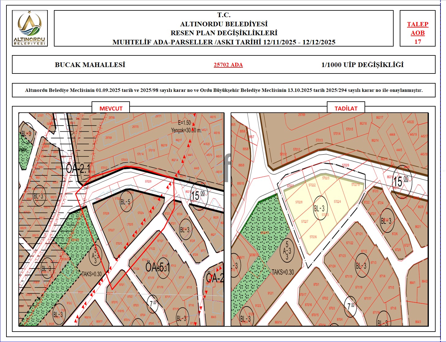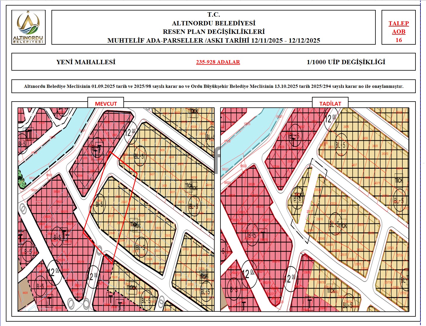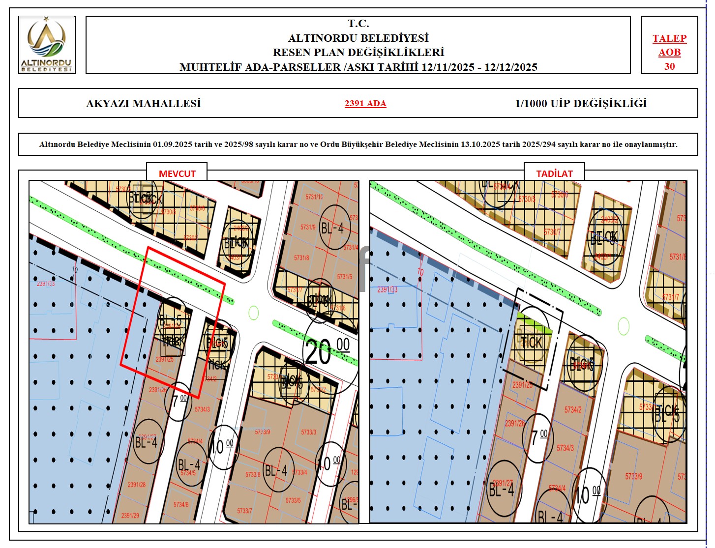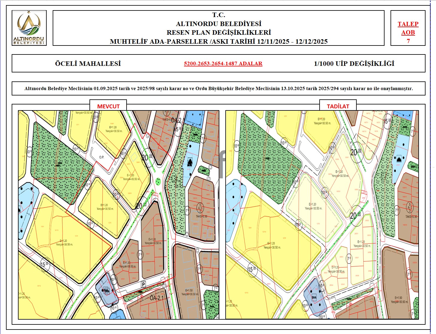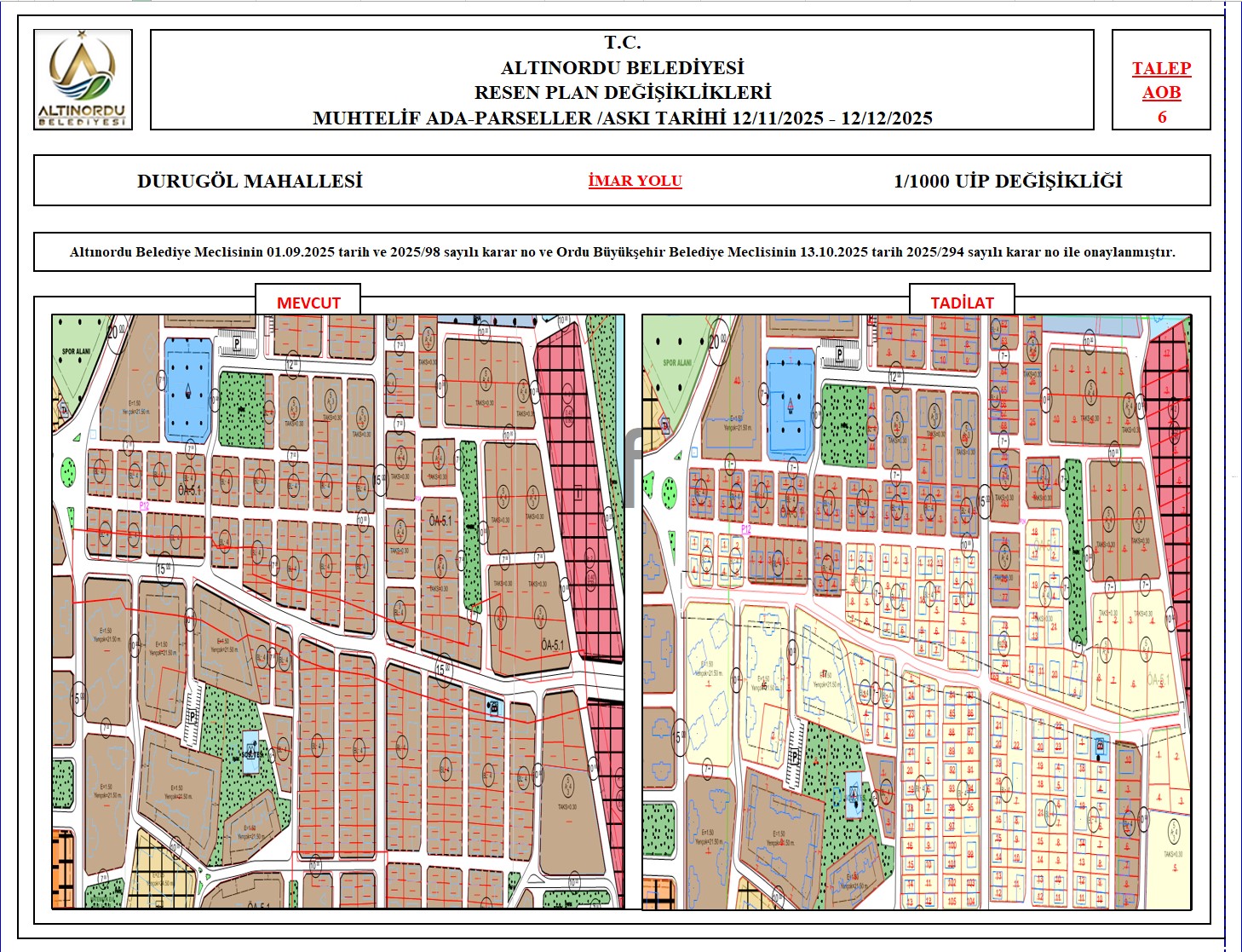 İlimiz, Altınordu İlçesi̇ uygulama imar planı onama sınırları ı̇çerı̇sı̇nde, Ordu Büyükşehir Belediyesi tarafından yapılan nazım imar plan değişikliklerine istinaden; alt ölçekleri planların üst ölçekli planlara uyum şartı esas olduğundan ve uygulamada karşılaşılan sorunların çözümüne yönelik; muhtelif ada/parsellerde Pin UİP:001106375 numaralı 1/1000 ölçekli Uygulama İmar Plan Değişikliği Altınordu Belediye Meclisinin 01.09.2025 tarih ve 2025/98 sayılı karar no ve Ordu Büyükşehir Belediye Meclisinin 13.10.2025 tarih 2025/294 sayılı karar no ile onaylanmış imar kanunun 8b maddesi gereğince 12/11/2025 – 12/12/2025 tarihleri arasında askıya çıkarılmıştır.