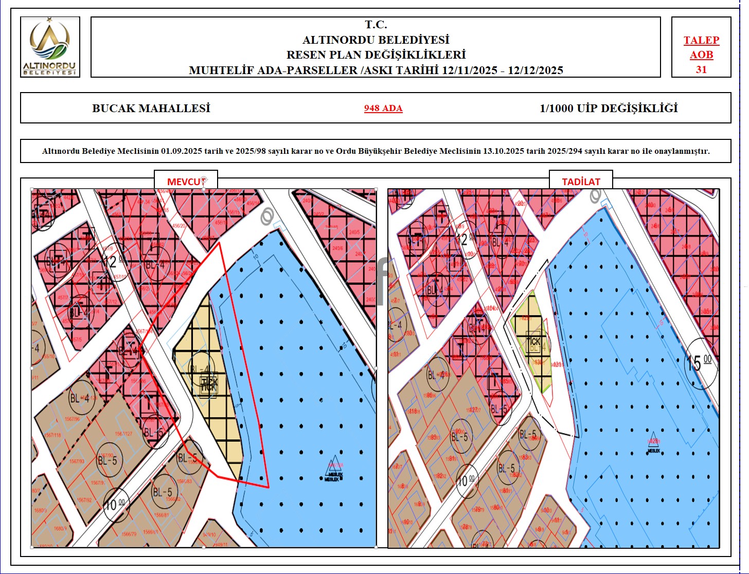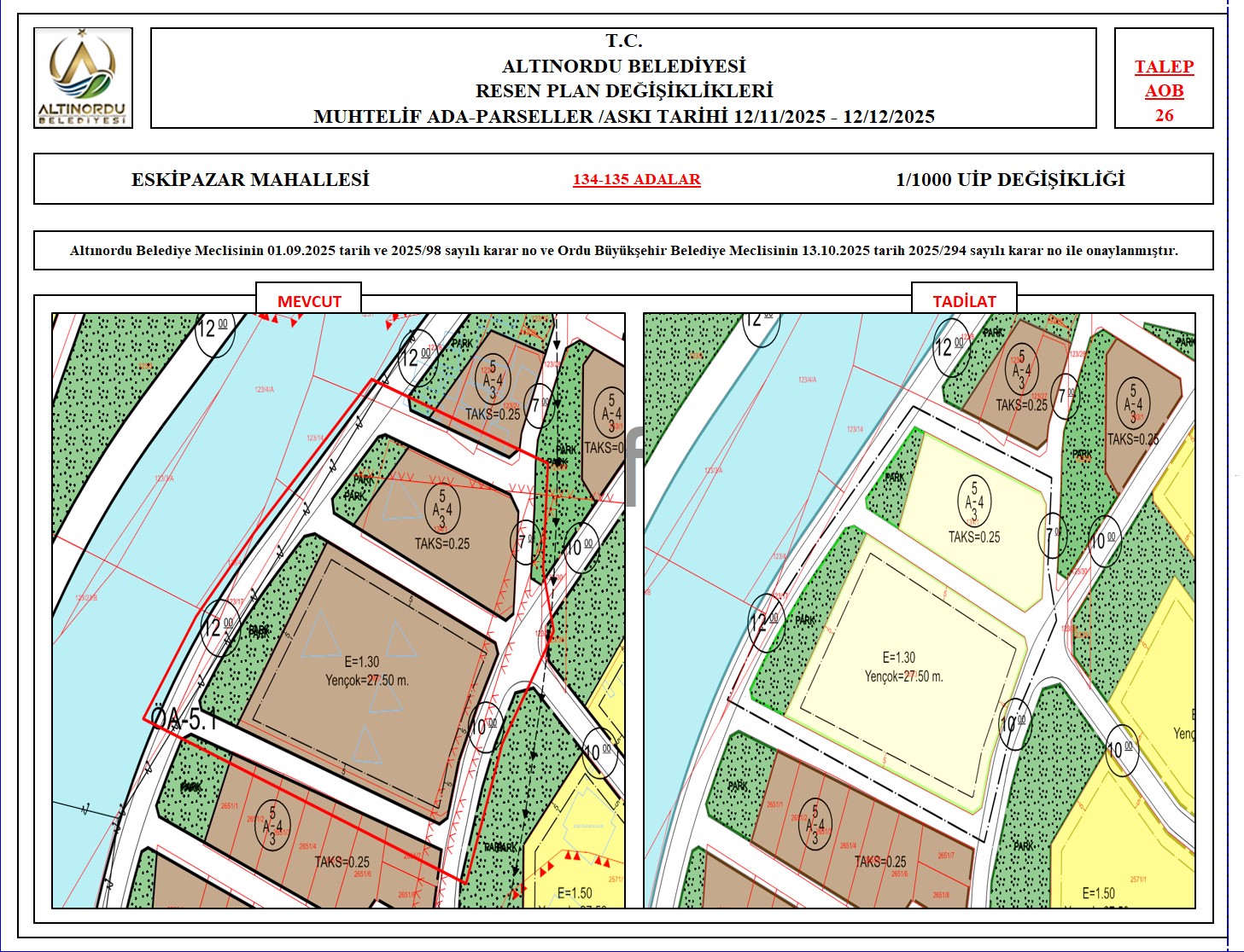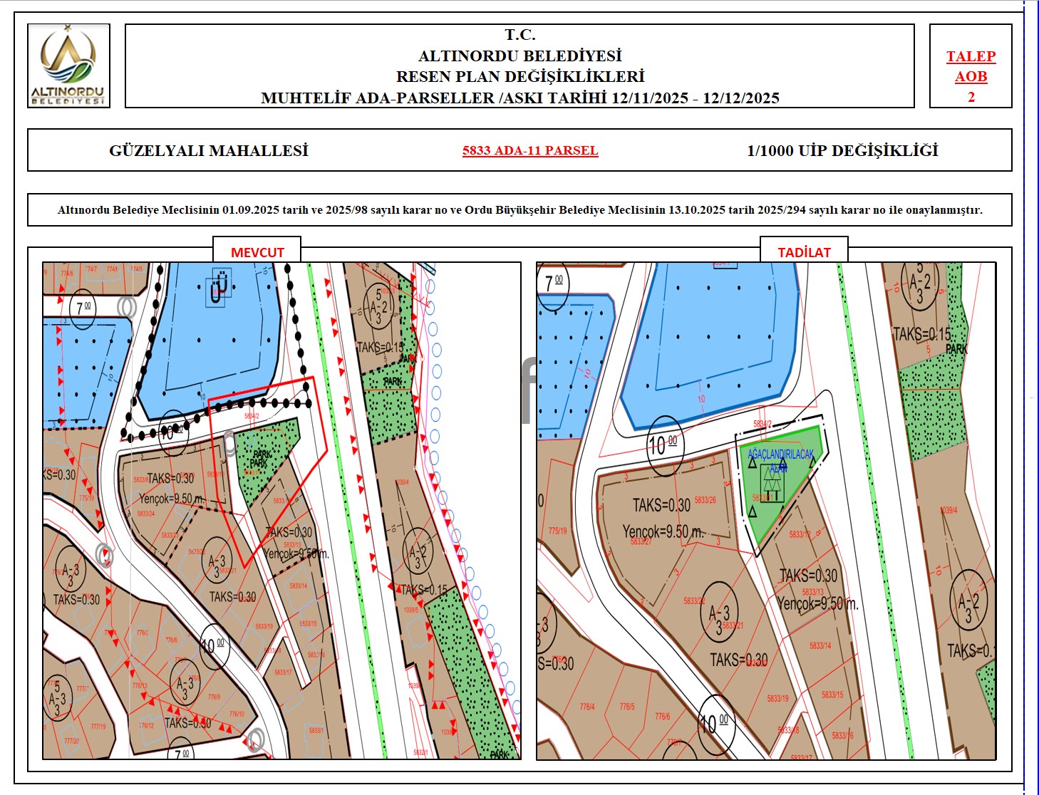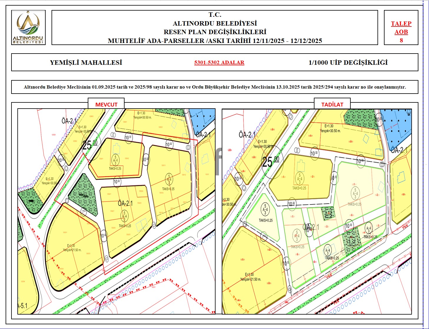 İlimiz, Altınordu İlçesi̇ uygulama imar planı onama sınırları ı̇çerı̇sı̇nde, Ordu Büyükşehir Belediyesi tarafından yapılan nazım imar plan değişikliklerine istinaden; alt ölçekleri planların üst ölçekli planlara uyum şartı esas olduğundan ve uygulamada karşılaşılan sorunların çözümüne yönelik; muhtelif ada/parsellerde Pin UİP:001106375 numaralı 1/1000 ölçekli Uygulama İmar Plan Değişikliği Altınordu Belediye Meclisinin 01.09.2025 tarih ve 2025/98 sayılı karar no ve Ordu Büyükşehir Belediye Meclisinin 13.10.2025 tarih 2025/294 sayılı karar no ile onaylanmış imar kanunun 8b maddesi gereğince 12/11/2025 – 12/12/2025 tarihleri arasında askıya çıkarılmıştır.