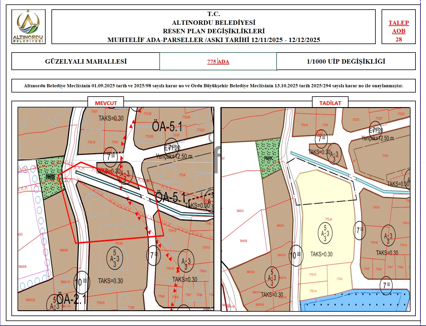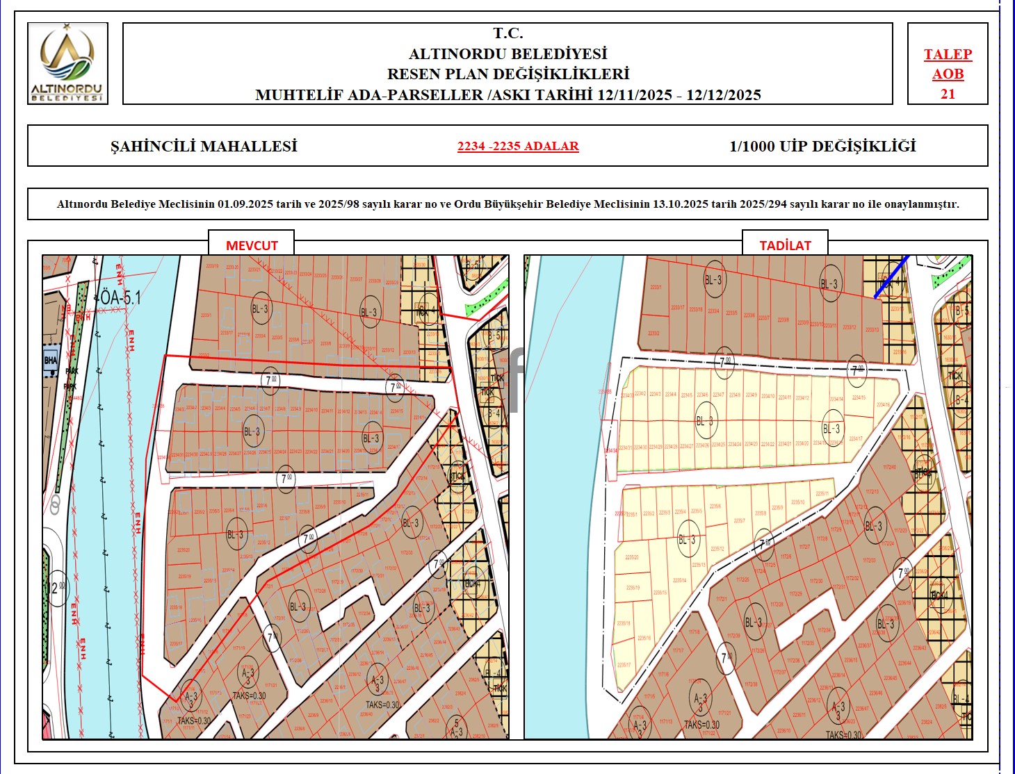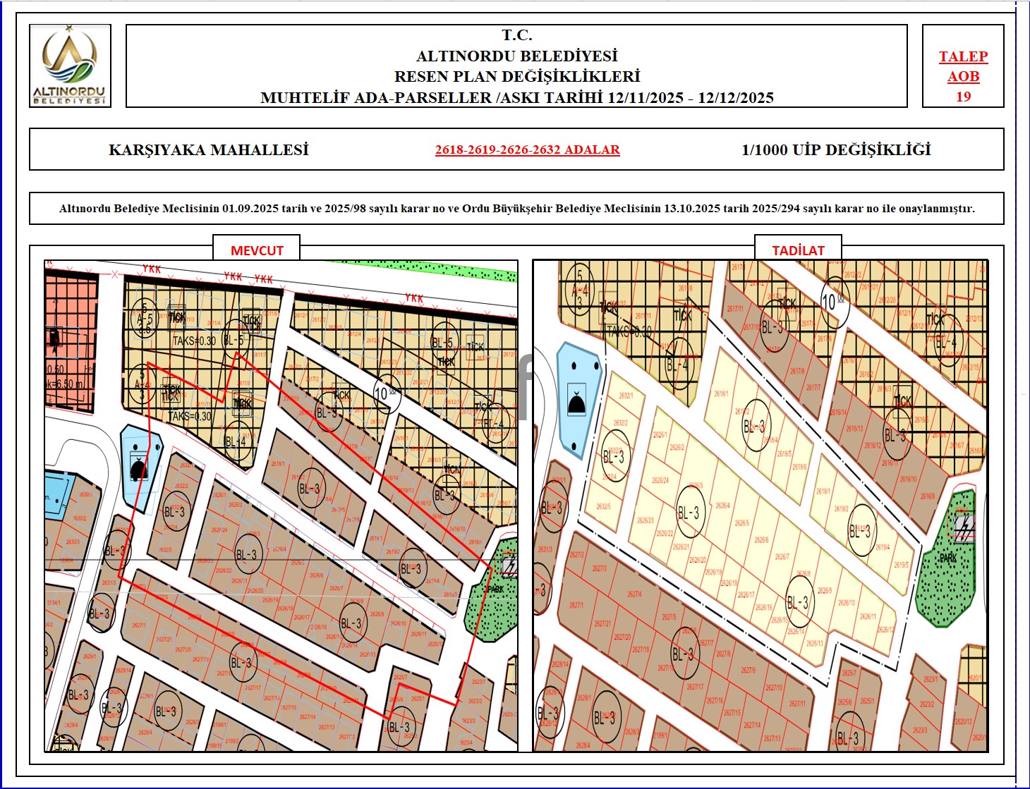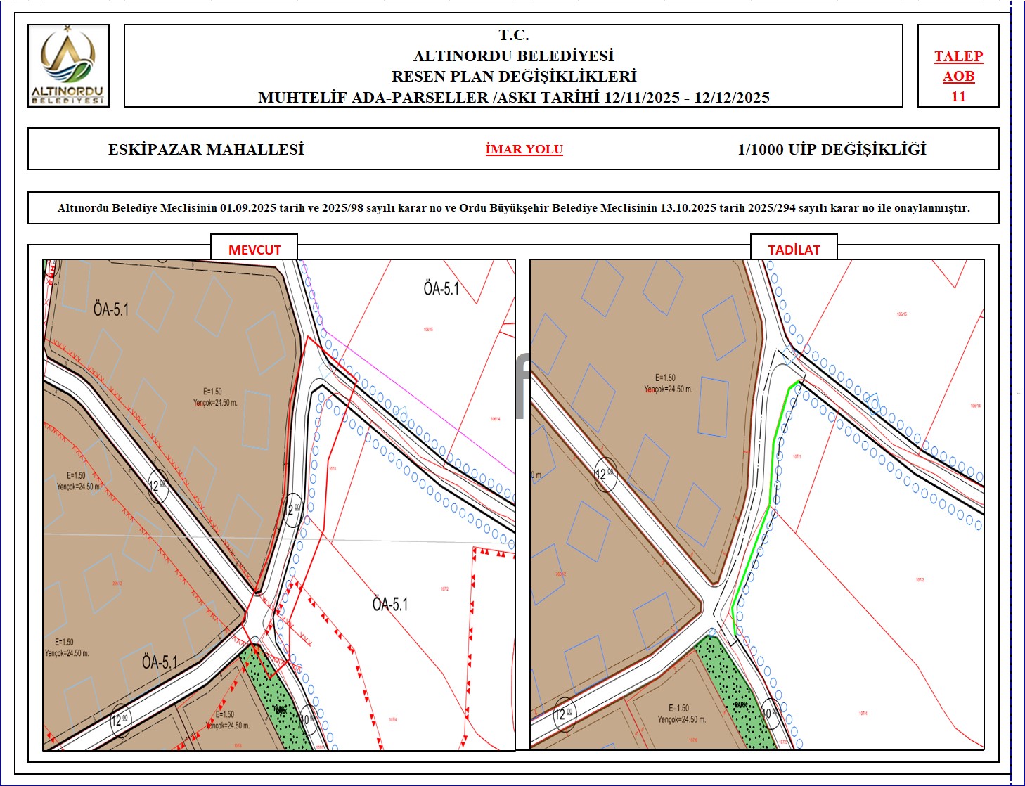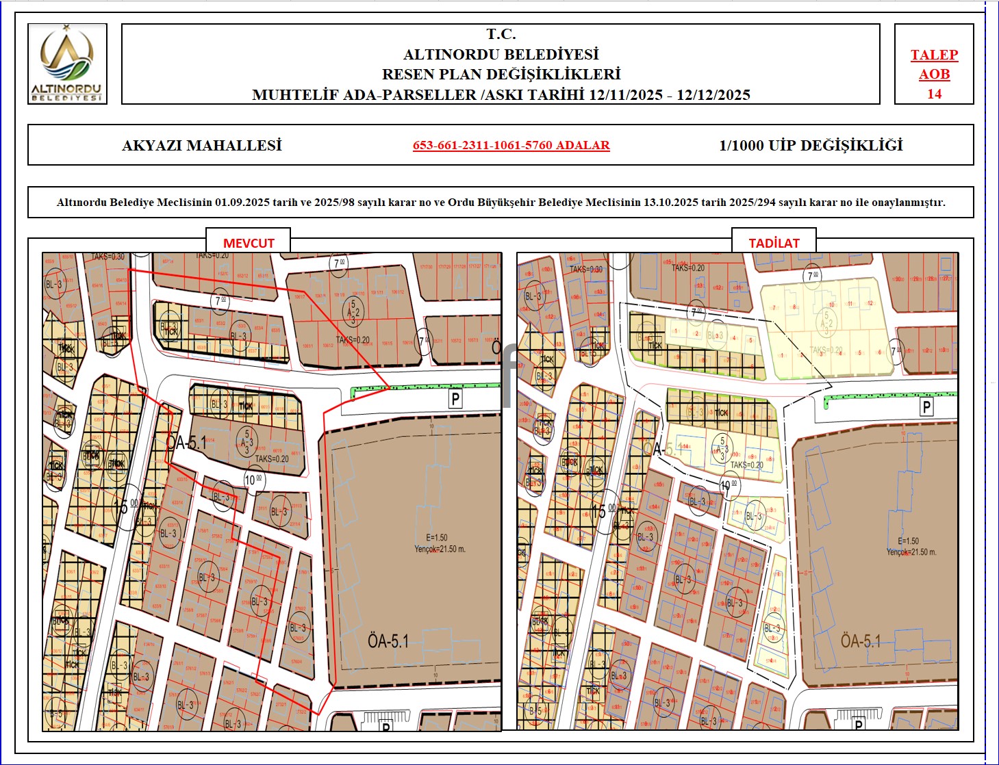 İlimiz, Altınordu İlçesi̇ uygulama imar planı onama sınırları ı̇çerı̇sı̇nde, Ordu Büyükşehir Belediyesi tarafından yapılan nazım imar plan değişikliklerine istinaden; alt ölçekleri planların üst ölçekli planlara uyum şartı esas olduğundan ve uygulamada karşılaşılan sorunların çözümüne yönelik; muhtelif ada/parsellerde Pin UİP:001106375 numaralı 1/1000 ölçekli Uygulama İmar Plan Değişikliği Altınordu Belediye Meclisinin 01.09.2025 tarih ve 2025/98 sayılı karar no ve Ordu Büyükşehir Belediye Meclisinin 13.10.2025 tarih 2025/294 sayılı karar no ile onaylanmış imar kanunun 8b maddesi gereğince 12/11/2025 – 12/12/2025 tarihleri arasında askıya çıkarılmıştır.