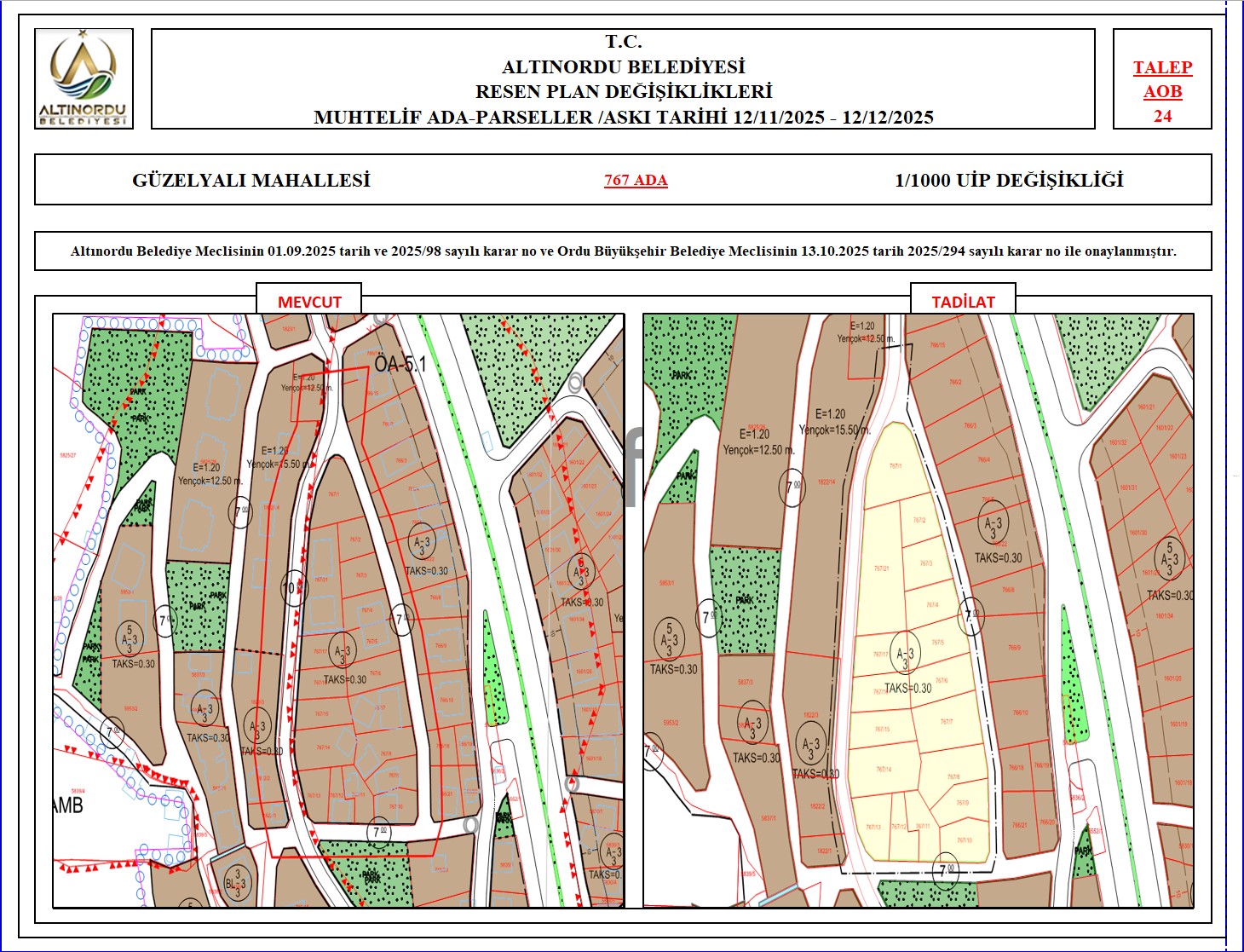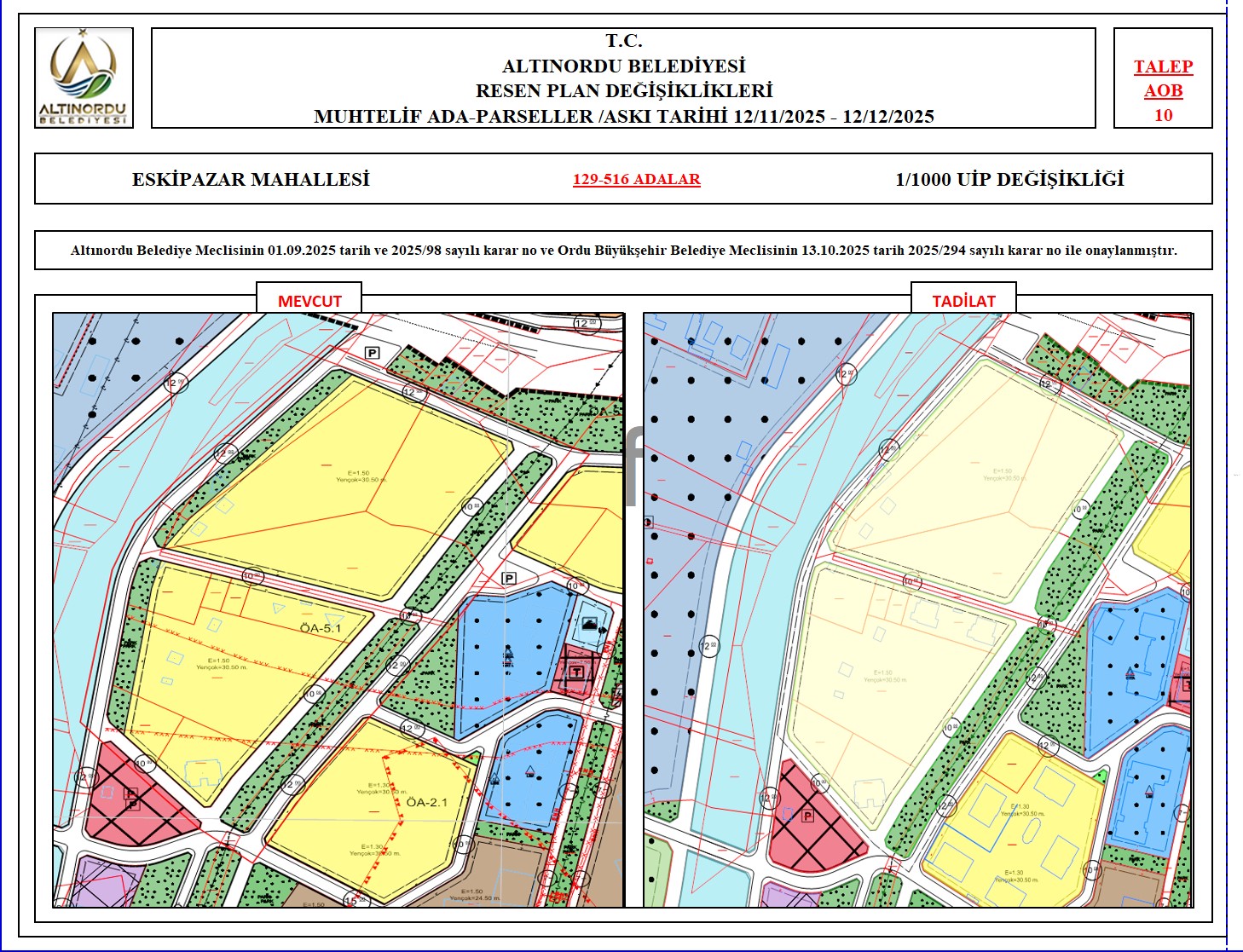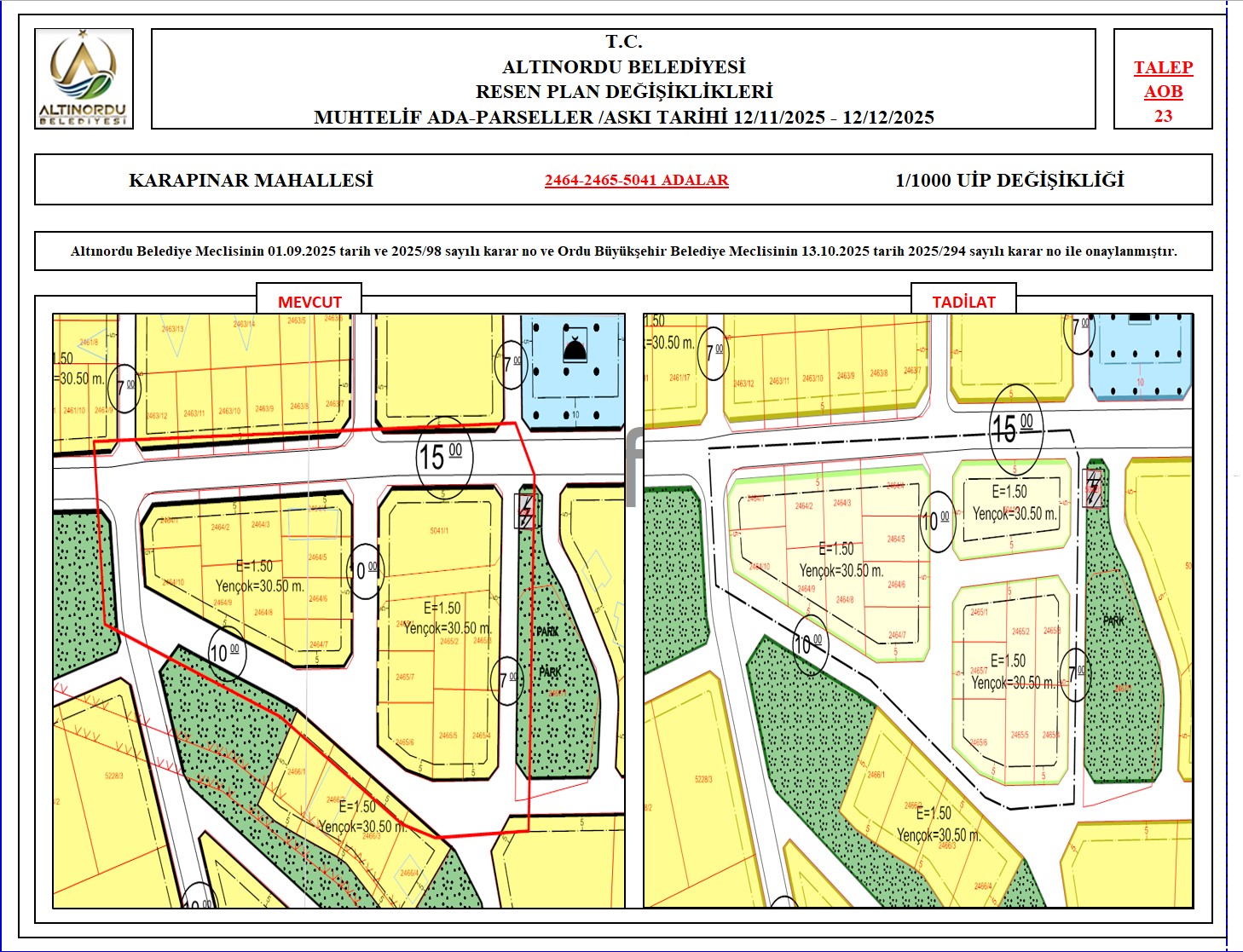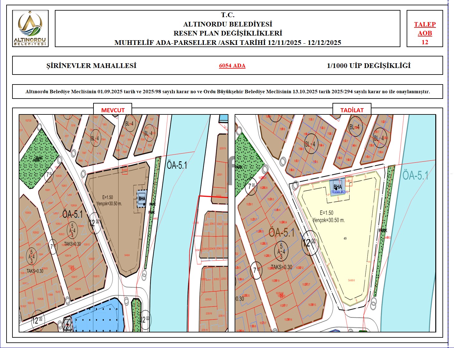İlimiz, Altınordu İlçesi̇ uygulama imar planı onama sınırları ı̇çerı̇sı̇nde, Ordu Büyükşehir Belediyesi tarafından yapılan nazım imar plan değişikliklerine istinaden; alt ölçekleri planların üst ölçekli planlara uyum şartı esas olduğundan ve uygulamada karşılaşılan sorunların çözümüne yönelik; muhtelif ada/parsellerde Pin UİP:001106375 numaralı 1/1000 ölçekli Uygulama İmar Plan Değişikliği Altınordu Belediye Meclisinin 01.09.2025 tarih ve 2025/98 sayılı karar no ve Ordu Büyükşehir Belediye Meclisinin 13.10.2025 tarih 2025/294 sayılı karar no ile onaylanmış imar kanunun 8b maddesi gereğince 12/11/2025 – 12/12/2025 tarihleri arasında askıya çıkarılmıştır.