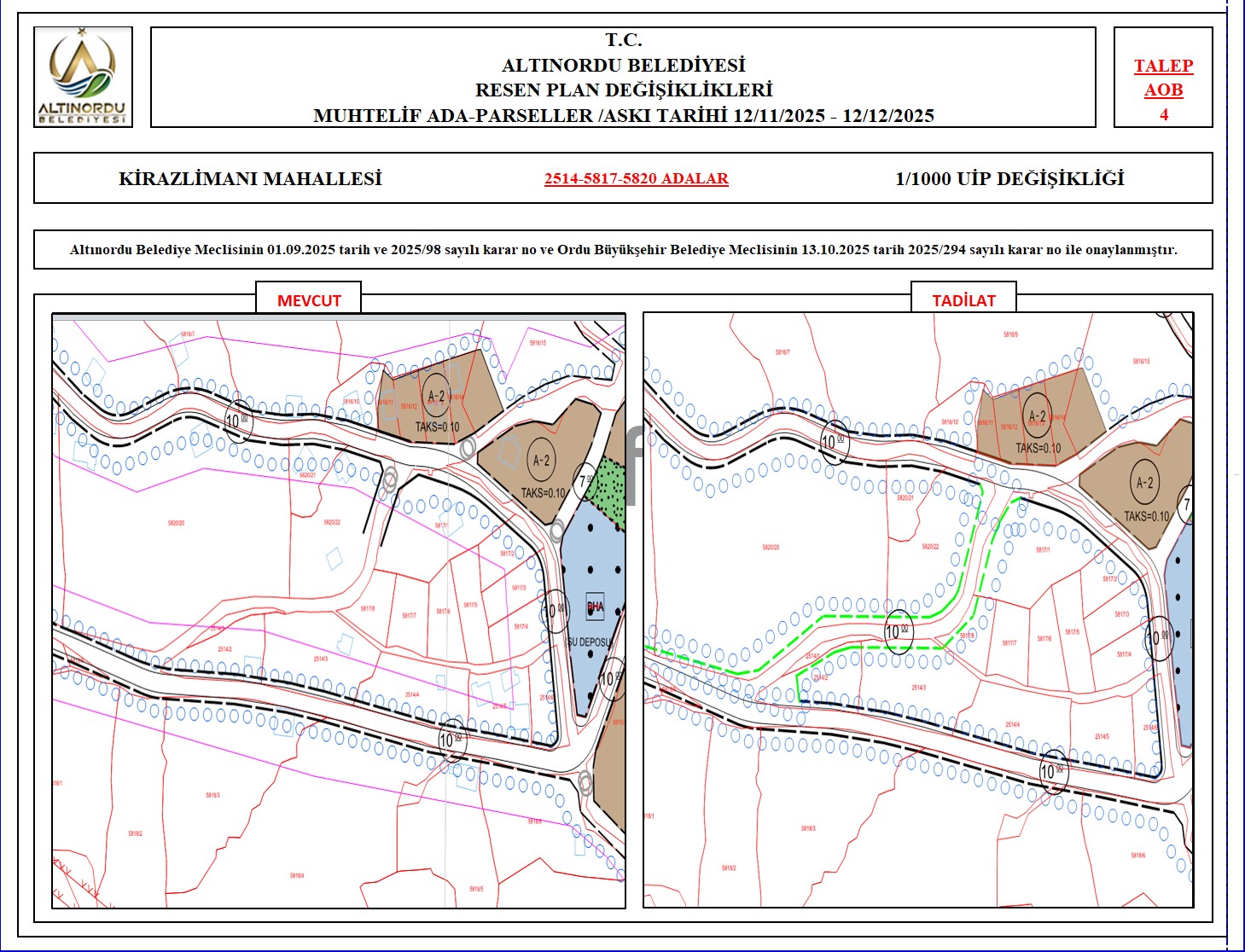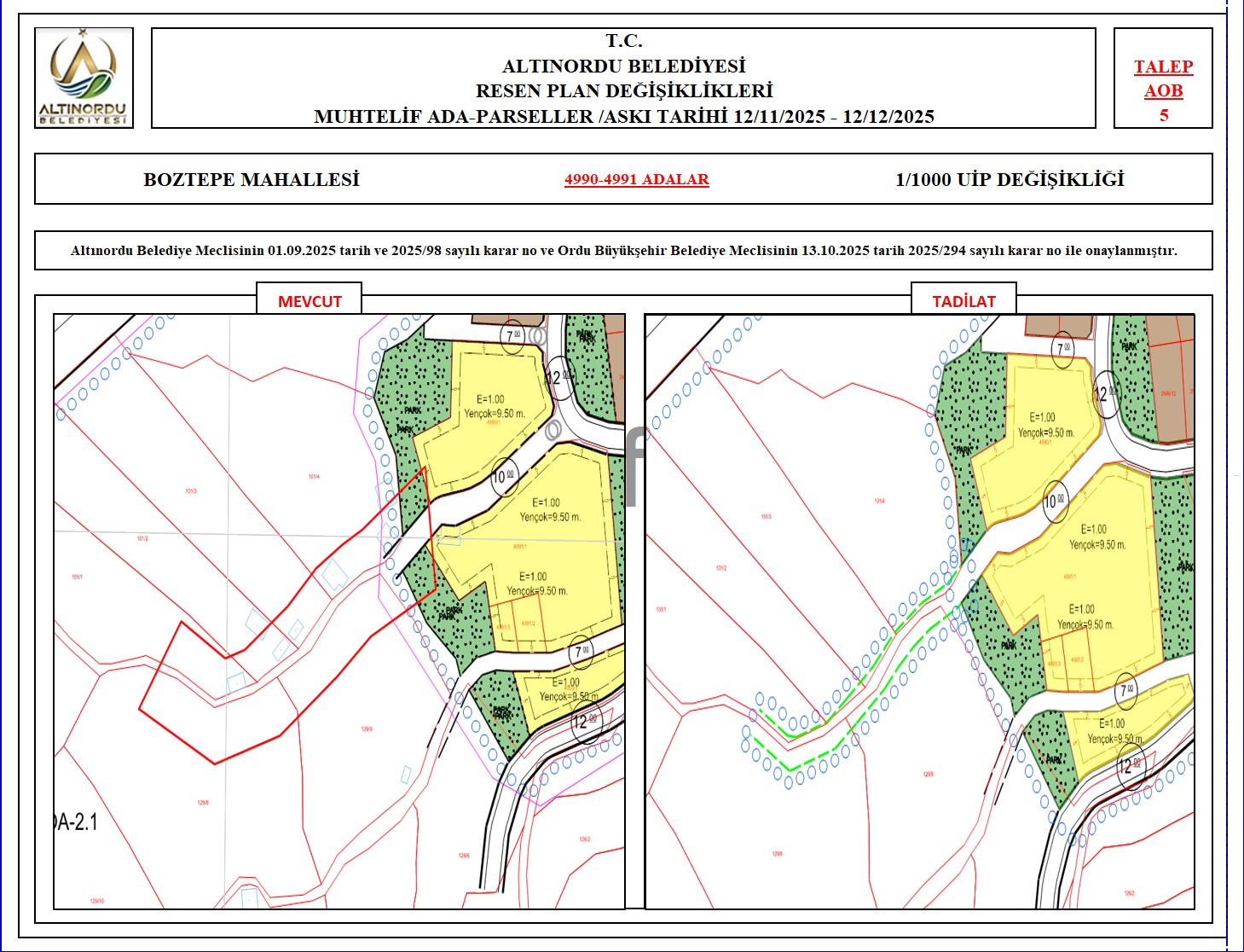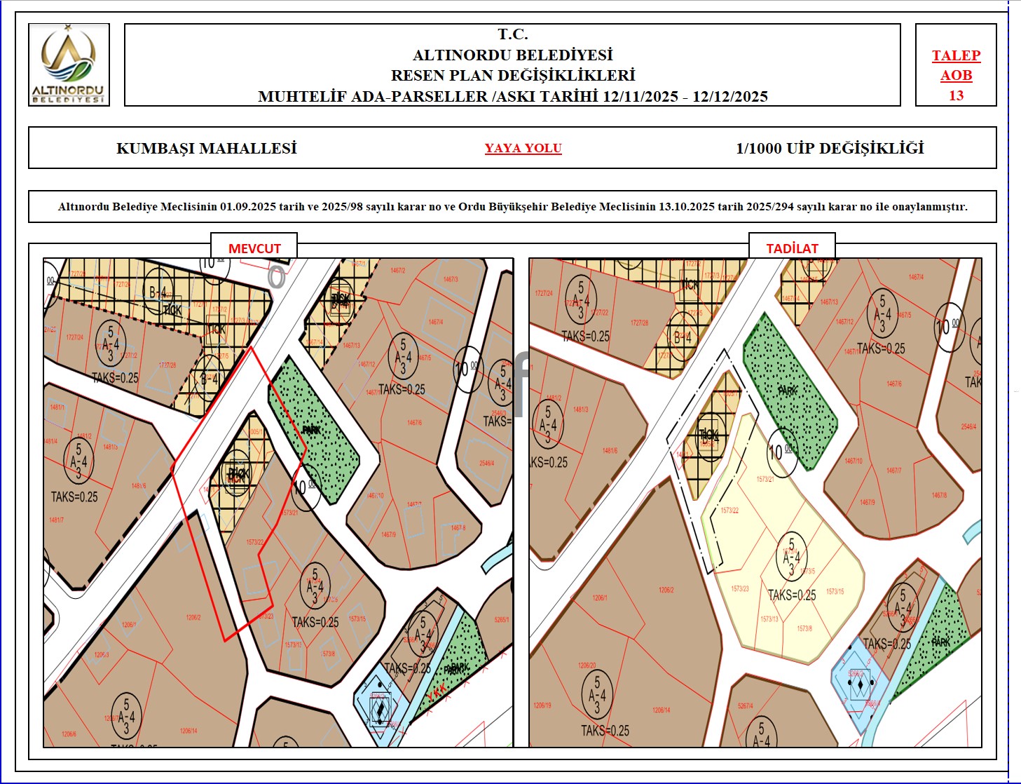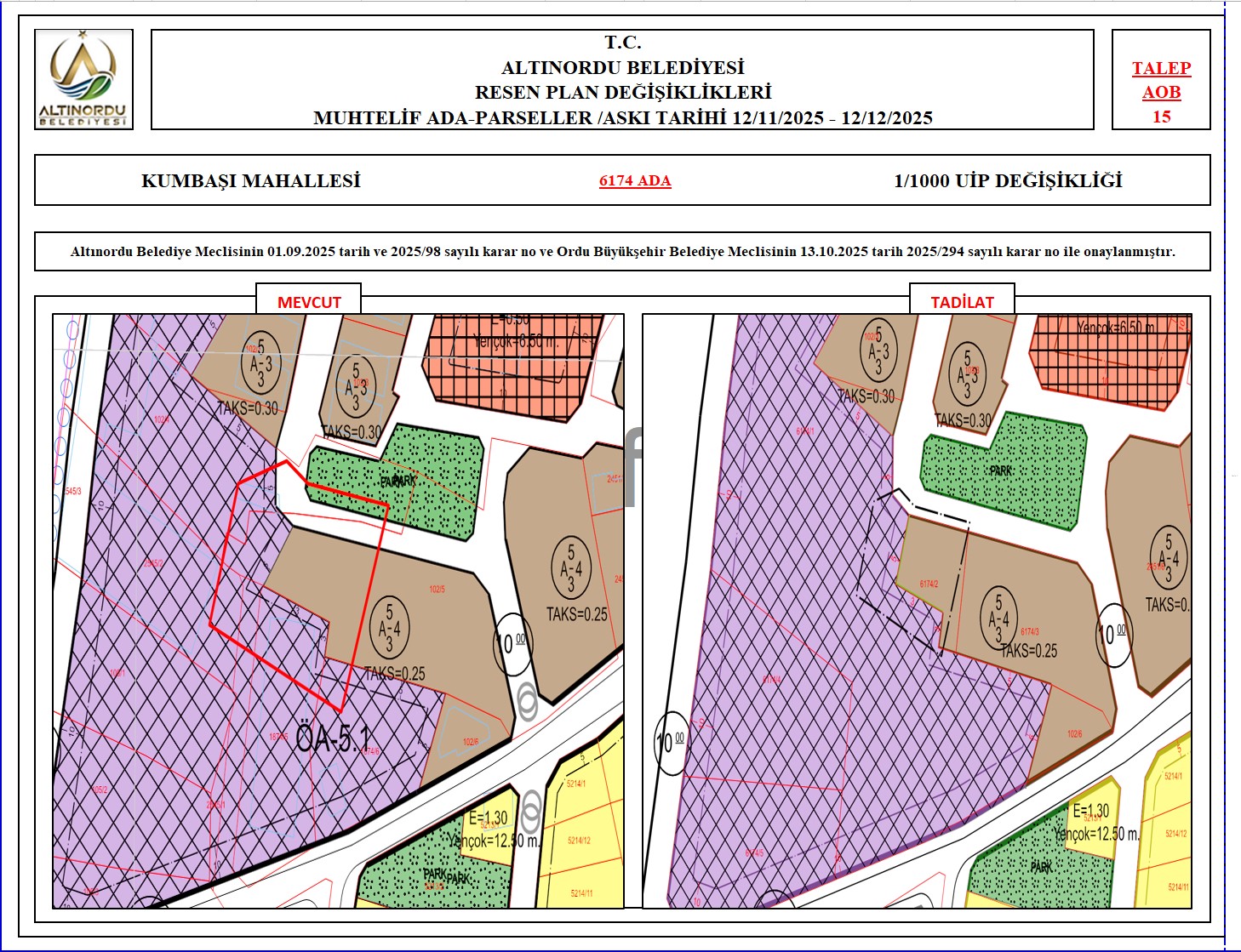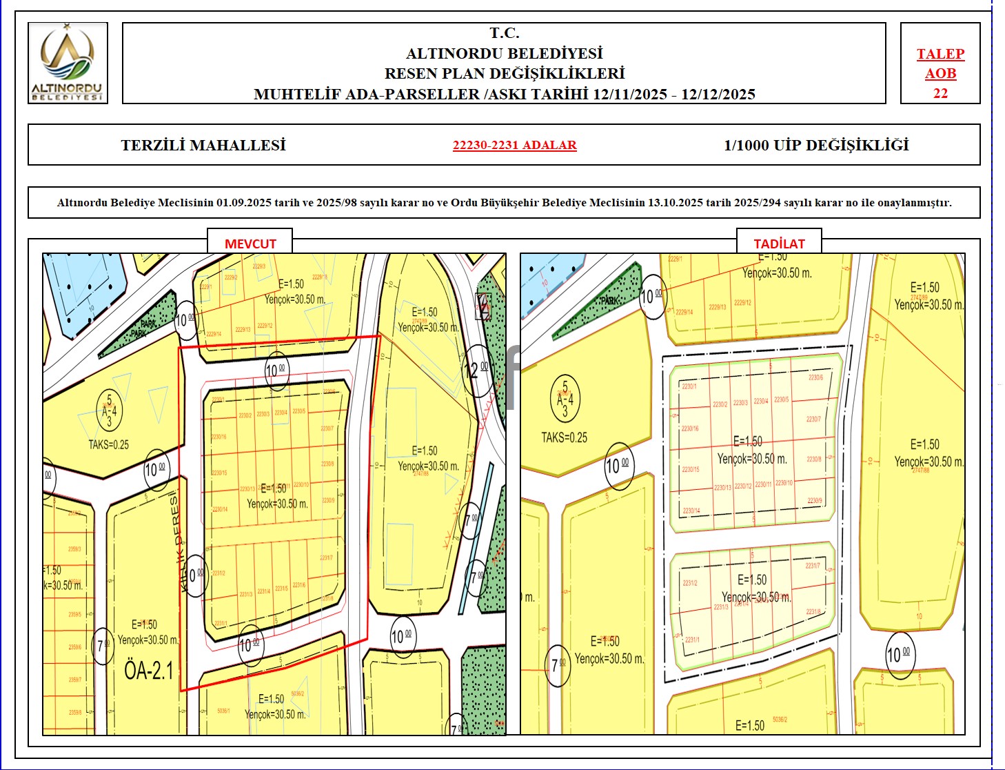 İlimiz, Altınordu İlçesi̇ uygulama imar planı onama sınırları ı̇çerı̇sı̇nde, Ordu Büyükşehir Belediyesi tarafından yapılan nazım imar plan değişikliklerine istinaden; alt ölçekleri planların üst ölçekli planlara uyum şartı esas olduğundan ve uygulamada karşılaşılan sorunların çözümüne yönelik; muhtelif ada/parsellerde Pin UİP:001106375 numaralı 1/1000 ölçekli Uygulama İmar Plan Değişikliği Altınordu Belediye Meclisinin 01.09.2025 tarih ve 2025/98 sayılı karar no ve Ordu Büyükşehir Belediye Meclisinin 13.10.2025 tarih 2025/294 sayılı karar no ile onaylanmış imar kanunun 8b maddesi gereğince 12/11/2025 – 12/12/2025 tarihleri arasında askıya çıkarılmıştır.